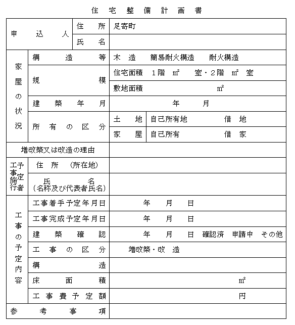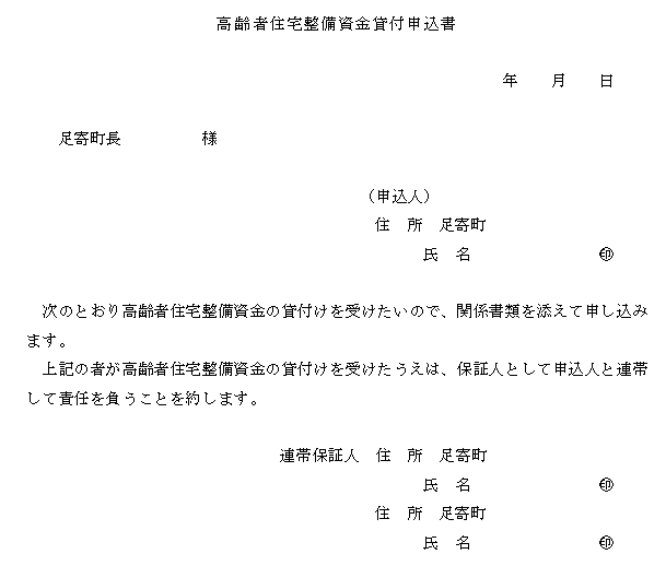 第2条 高齢者住宅整備資金(以下「整備資金」という。)の貸付けを受けようとする者(以下「申込人」という。)は、高齢者住宅整備資金貸付申込書(