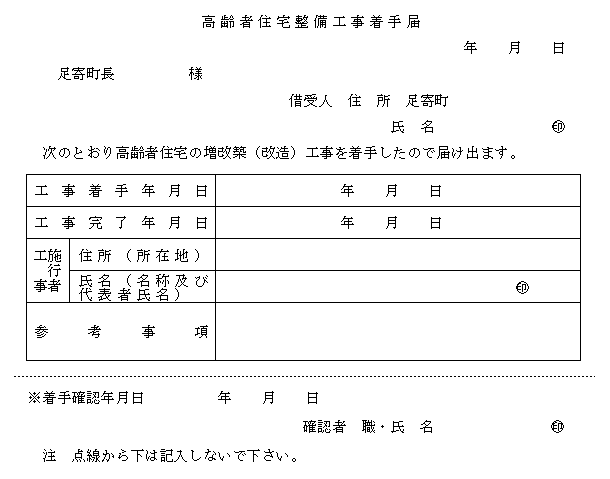 2 借受人は、前1項に定める期間内に高齢者住宅の増改築又は改造工事に着手したときは、すみやかに高齢者住宅整備工事着手届(