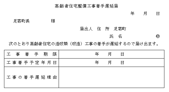 3 借受人は、第1項に定める期間内に高齢者住宅の増改築又は改造の工事に着手することができない理由が発生したときは、その理由の発生後、すみやかに高齢者住宅整備工事着手遅延届(
