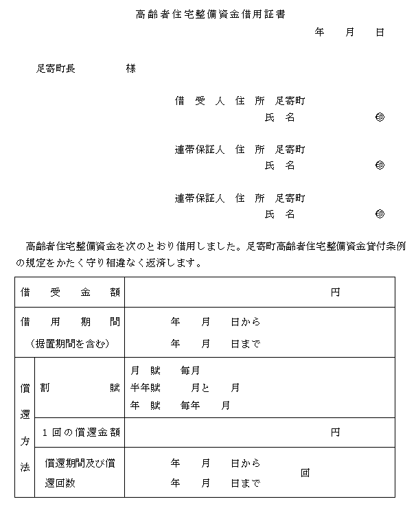 第8条 借受人は、貸付金の交付を受けるときは、高齢者住宅整備資金借用証書(