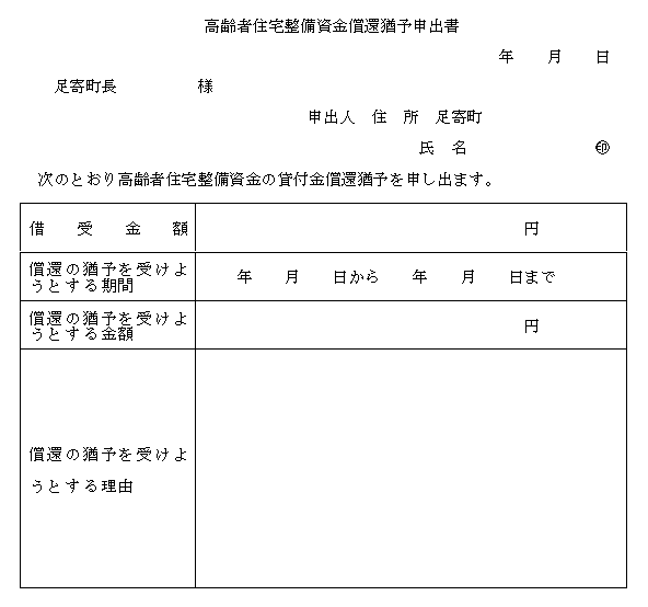 2 借受人は、前項の規定により貸付金の償還の猶予を受けようとするときは、高齢者住宅整備資金償還猶予申出書(