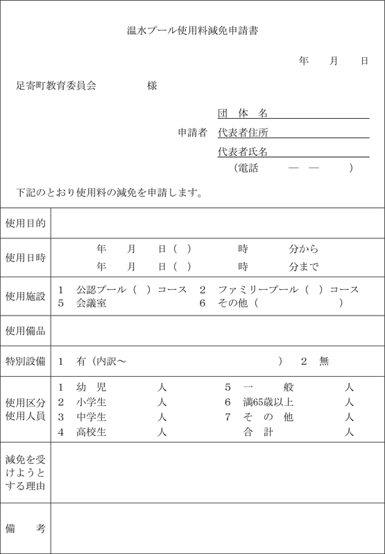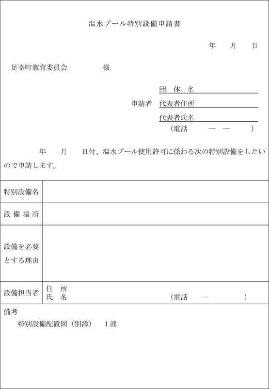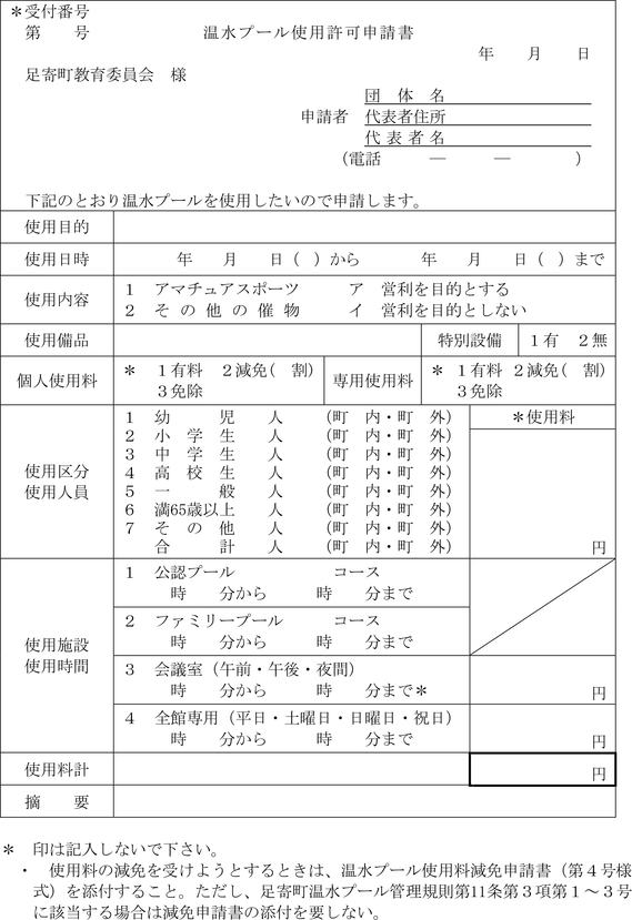 第5条 条例第3条第2項の規定により温水プールを使用しようとする者は、使用日の3月から7日前までに、温水プール使用許可申請書(第1号様式)を教育委員会に提出しなければならない。ただし、教育委員会が特別な事情があると認めた場合は、この限りでない。