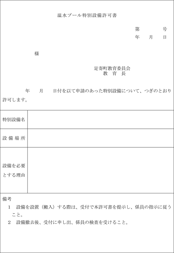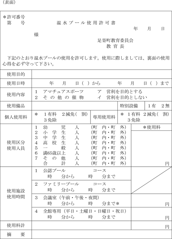 第6条 教育委員会は、前条第1項の使用を許可した場合は、温水プール使用許可書(以下「使用許可書」という。)(第2号様式)を申請者に交付する。