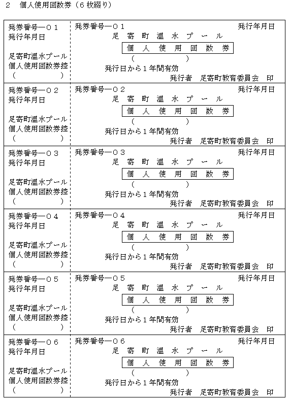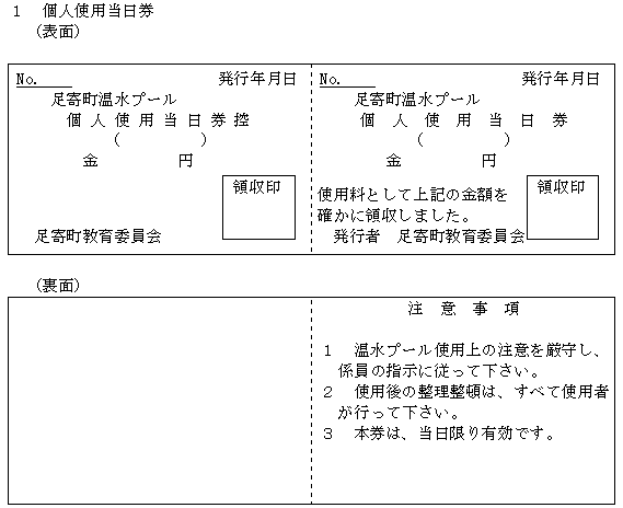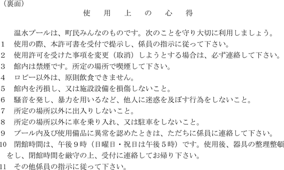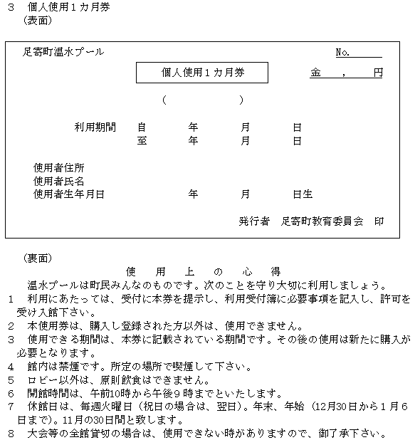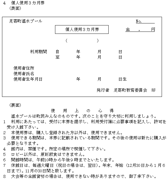 3 個人使用の許可を受けようとする者は、使用料と引き換えに、個人使用券(第1号の2様式)の交付を受けなければならない。ただし、幼児及び町内の高校生以下の使用料は無料とする。