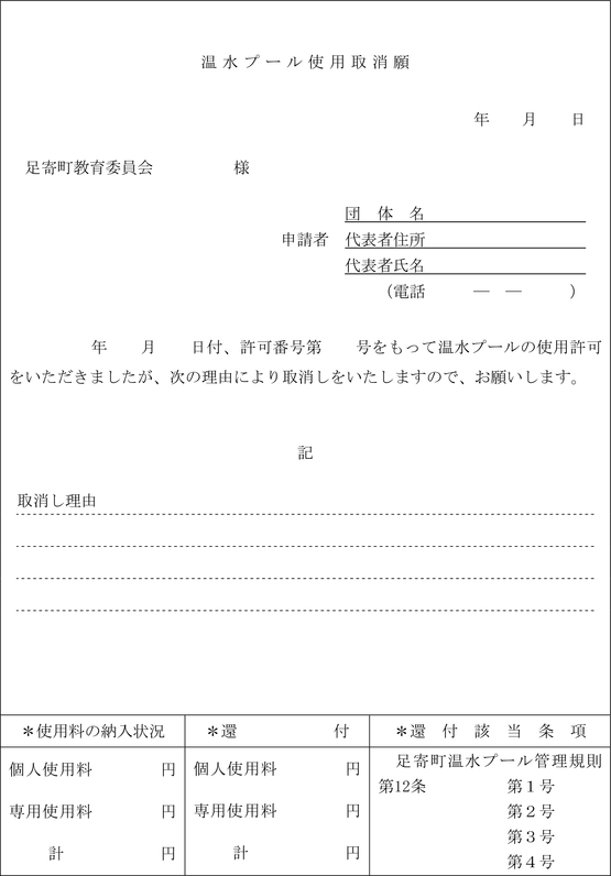 2 使用者は、使用の取り消しをしようとするときは、温水プール使用取消願(第3号様式)に使用許可書を添え、教育委員会に提出しなければならない。