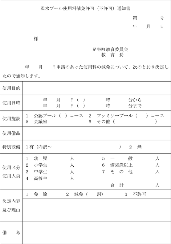 2 教育委員会は、使用料の減免の可否を決定したときは、温水プール使用料減免許可(不許可)通知書(第5号様式)により申請者にその旨を通知するものとする。