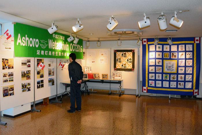 会場には、昨年9月22日から30日までの9日間、足寄高校1年生43人を含む一行49人が本町の姉妹都市先であるカナダ・アルバータ州ウェタスキウィン市でのホームステイや一日体験入学の写真が展示されている他、1998年の開町90周年の際に贈られたパッチワークなどの記念品なども飾られています。