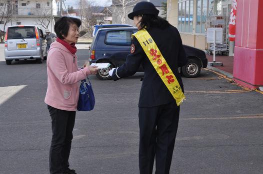 防火パレードでは消防車数台が町内を巡回し、防火PRでは消防団員らが市街地3か所のスーパーなどで買い物客に火災予防を呼び掛けるパンフレットとポケットティッシュを手渡しながら、火災への注意を呼び掛けていました。![]()
