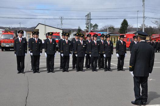 足寄消防団の連合演習が役場駐車場で行われ、団員115人、陸上自衛隊足寄分屯地隊員5人、消防車両12台が参加しました。団員たちは日頃の練習成果を発揮し、来賓や見学者に機械器具点検や小隊訓練、消防操法などを披露しました。