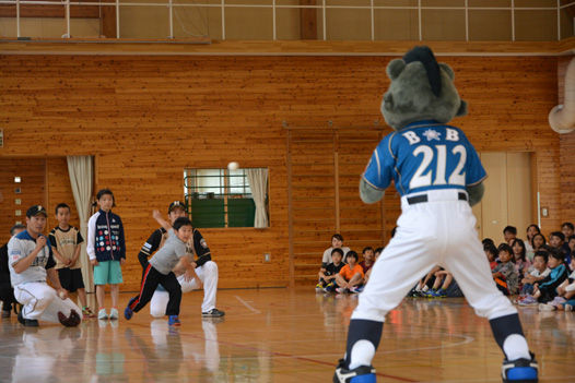 ファイターズベースボールアカデミーコーチ2人、ファイターズガール2人、B☆Bが足寄小学校を訪問し、町内の児童とYMCAのダンスやキャッチボールをして交流しました。