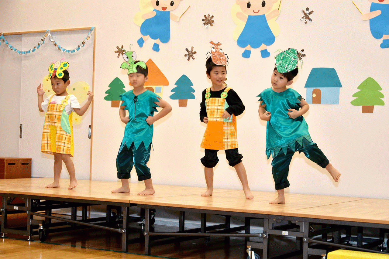 保育園児17人が「きらきらぼし」などの歌や「ブルブルブルドッグ」などの遊戯、「はらぺこあおむし」の舞踊劇など練習の成果を発表しました。また園児のなかには恥ずかしがっている子もいましたが、かわいらしい衣装を着て元気よく踊っていました。