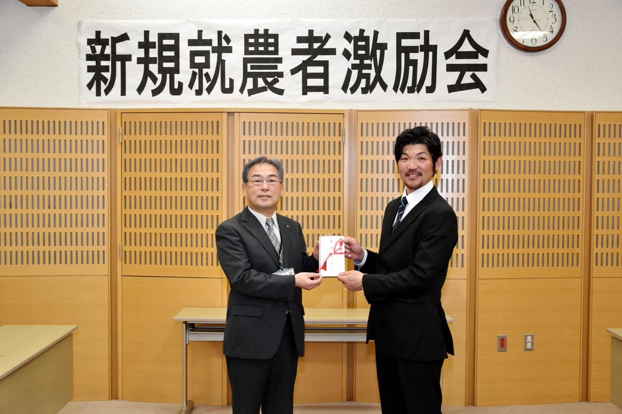 最後に、渡辺町長から羽根田さんに経営開始奨励金の目録が手渡されました。
