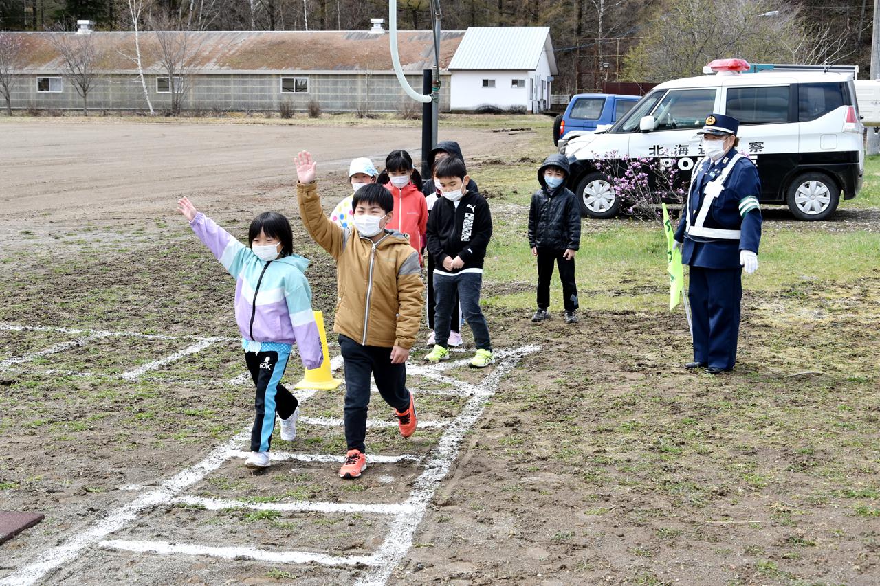 児童らは螺湾駐在所の寺井崇典所長および交通安全協会会員からの指導の下、同校グラウンドや市街地で横断歩道の渡り方、安全な自転車の走行について学習しました。