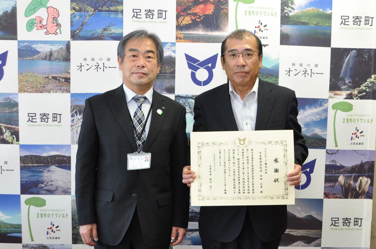 町は、地域貢献活動として雌阿寒温泉町営駐車場の区画線引きを行ったクリアロード株式会社(合田弘孝代表取締役社長)に感謝状を贈りました。