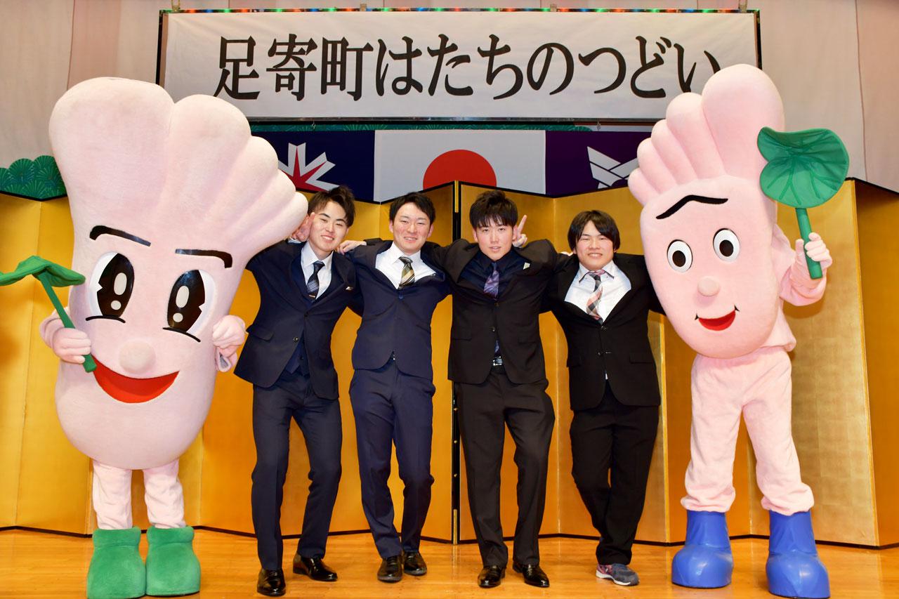 20歳を代表して村上武弥さんが「今日を迎えることができるのは、支えてくれた家族や先生、地域の方々、友人たちのおかげです。これからも自分らしさを失わずに、若者らしく一日一日を大切にしながら、成長していきたいと思います」と誓いの言葉を述べ、代表の島津建太さんと青砥悠さんに渡辺町長から記念品が手渡されました。