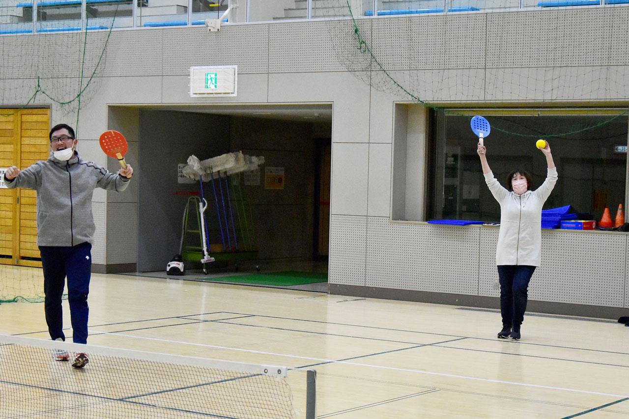 参加者は、総合体育館の職員らとダブルスゲームを行い、最初はボールを返すのにも苦戦をしていましたが、次第にラリーが続くようになり、楽しみながら汗をかきました。