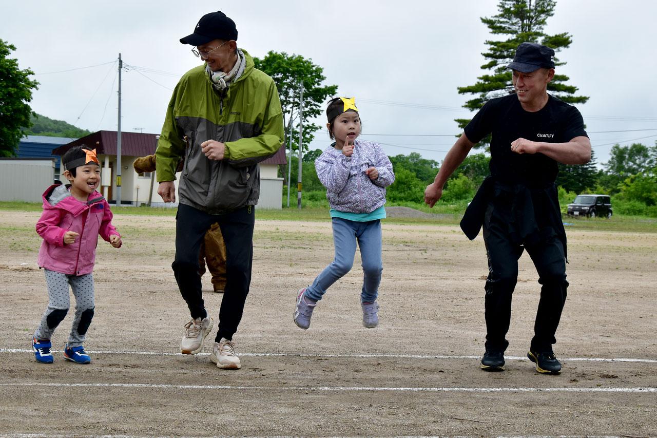 その後、雨も弱まり児童は、徒競走やYOSAKOIソーラン、リレー競技、親子での綱引き競技などに全力で取り組み、園児は親子で「しりとり動物レース」「へんしん!にんじゃんじゃん」を楽しみました。また地域の方々や来賓もパン食い競争などに参加して、みんなで大運動会を盛り上げました。
