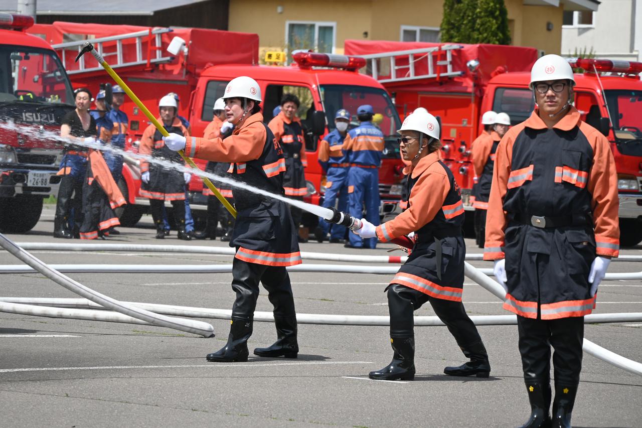 団員たちは日頃の訓練成果を発揮し、来賓や見学者に機械器具点検や小隊訓練、消防操法などを披露しました。連合演習には、町民をはじめ団員の家族が見学に訪れ、子どもたちの応援の声も聞こえました。
