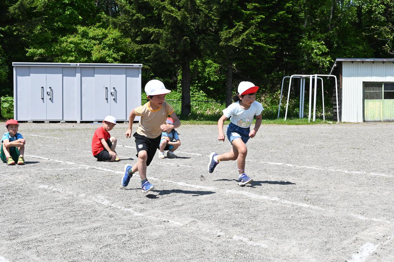芽登小学校(宮崎哲校長)と芽登保育所で合同運動会が開催され、渡辺俊一町長など来賓や多くの保護者、地域住民の方が観覧しました。