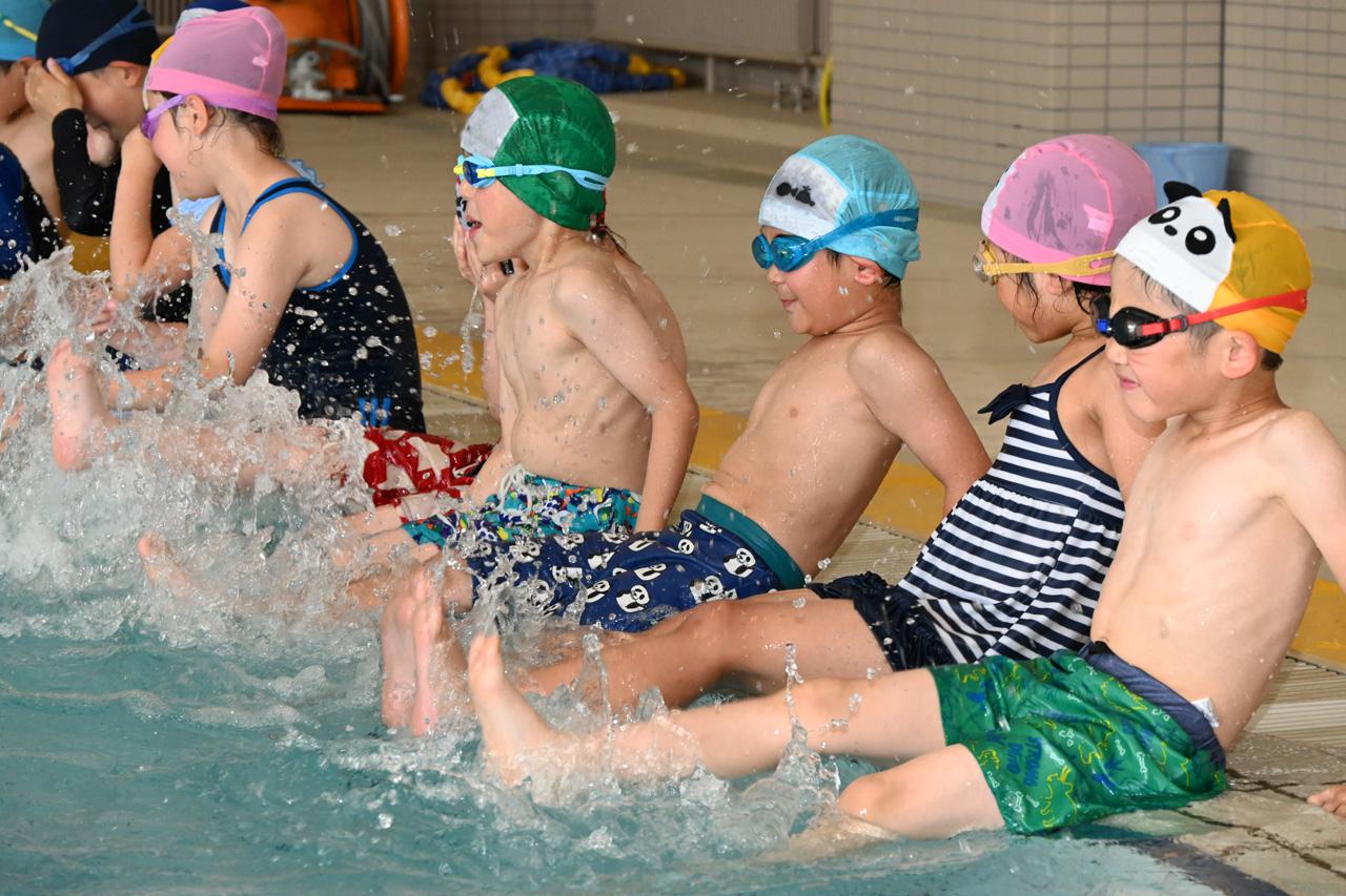 その後、町水泳協会会員の指導の下、ビート板を使った泳ぎの練習など、水泳の基礎を学びました。子どもたちは笑顔を見せながら、一生懸命に練習に取り組みました。