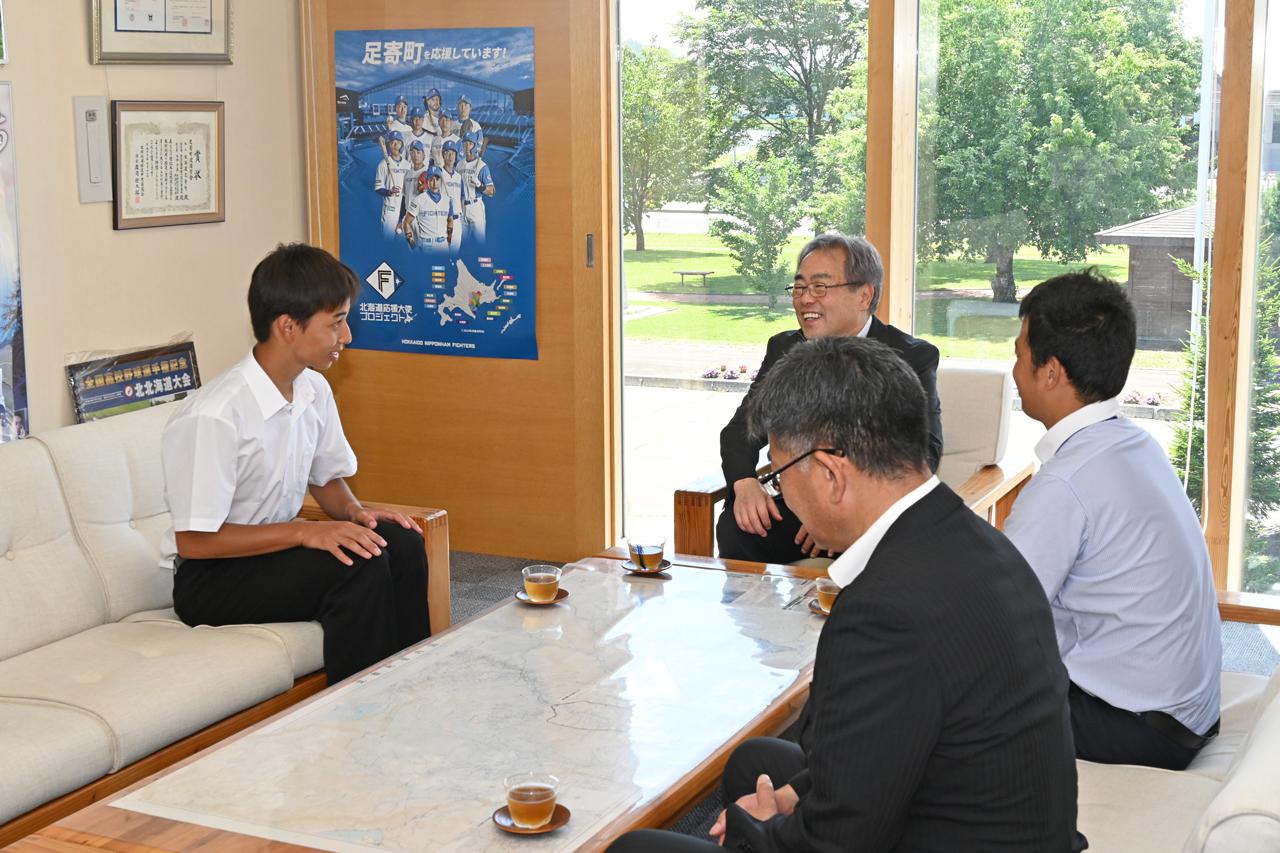 渡辺町長は「今まで努力した結果が全国大会出場につながったと思います。北海道との気候の違いに気を付けて、自分の力を最大限発揮できるよう頑張ってください」と激励しました。