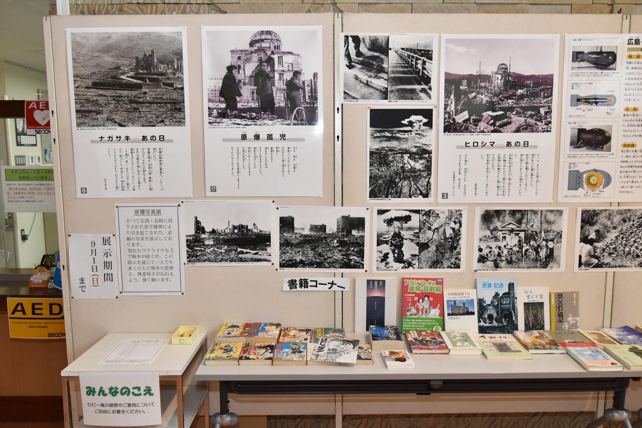 広島県と長崎県に落とされた原子爆弾の被害写真・絵を展示し、戦争の悲惨を伝えています。また原子爆弾の被害に関する書籍も展示されています。